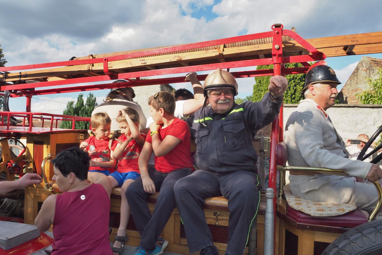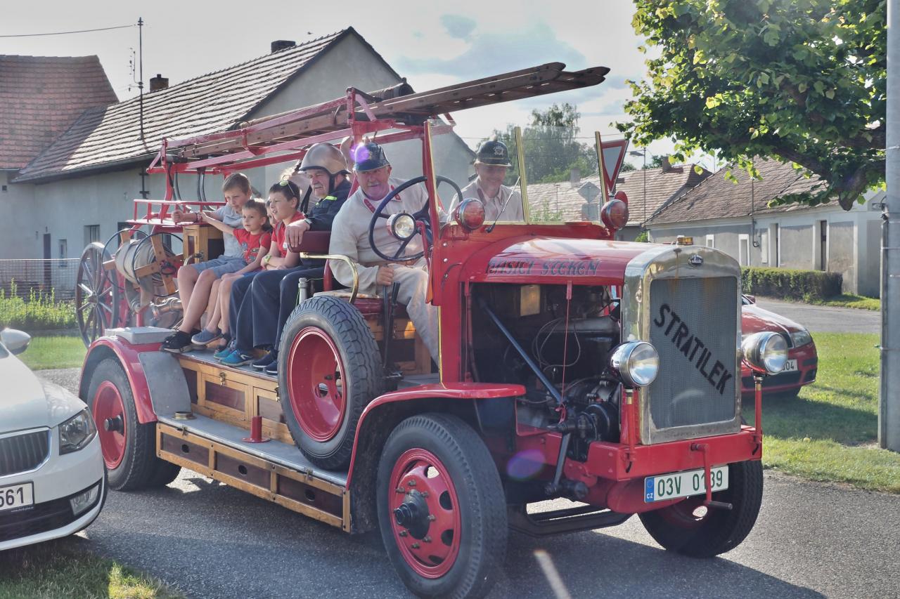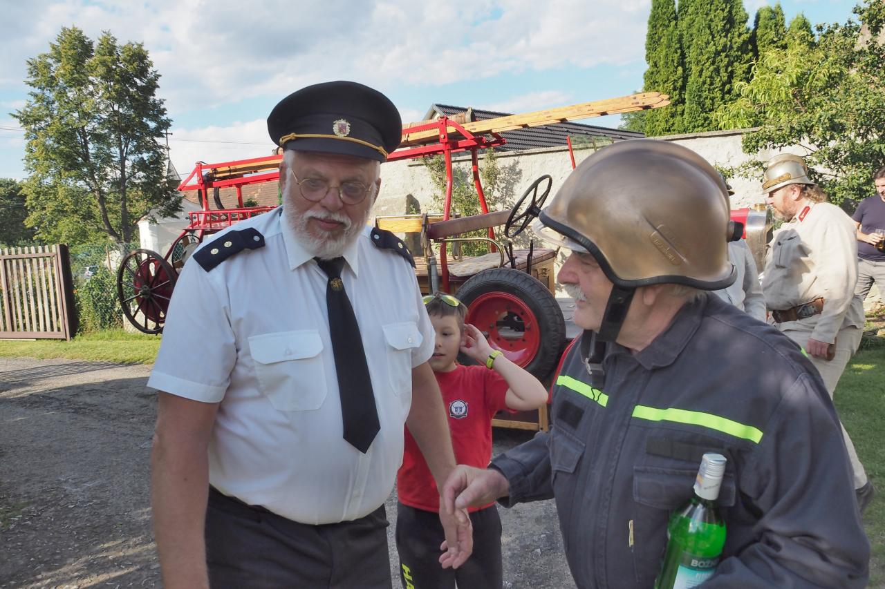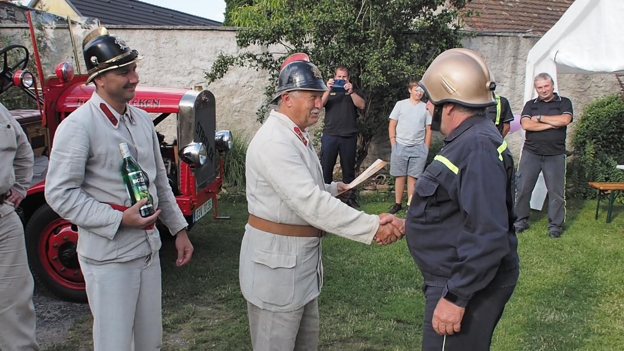 Štěkeňští hasiči mu přijeli popřát v historických uniformách a s historickou stříkačkou