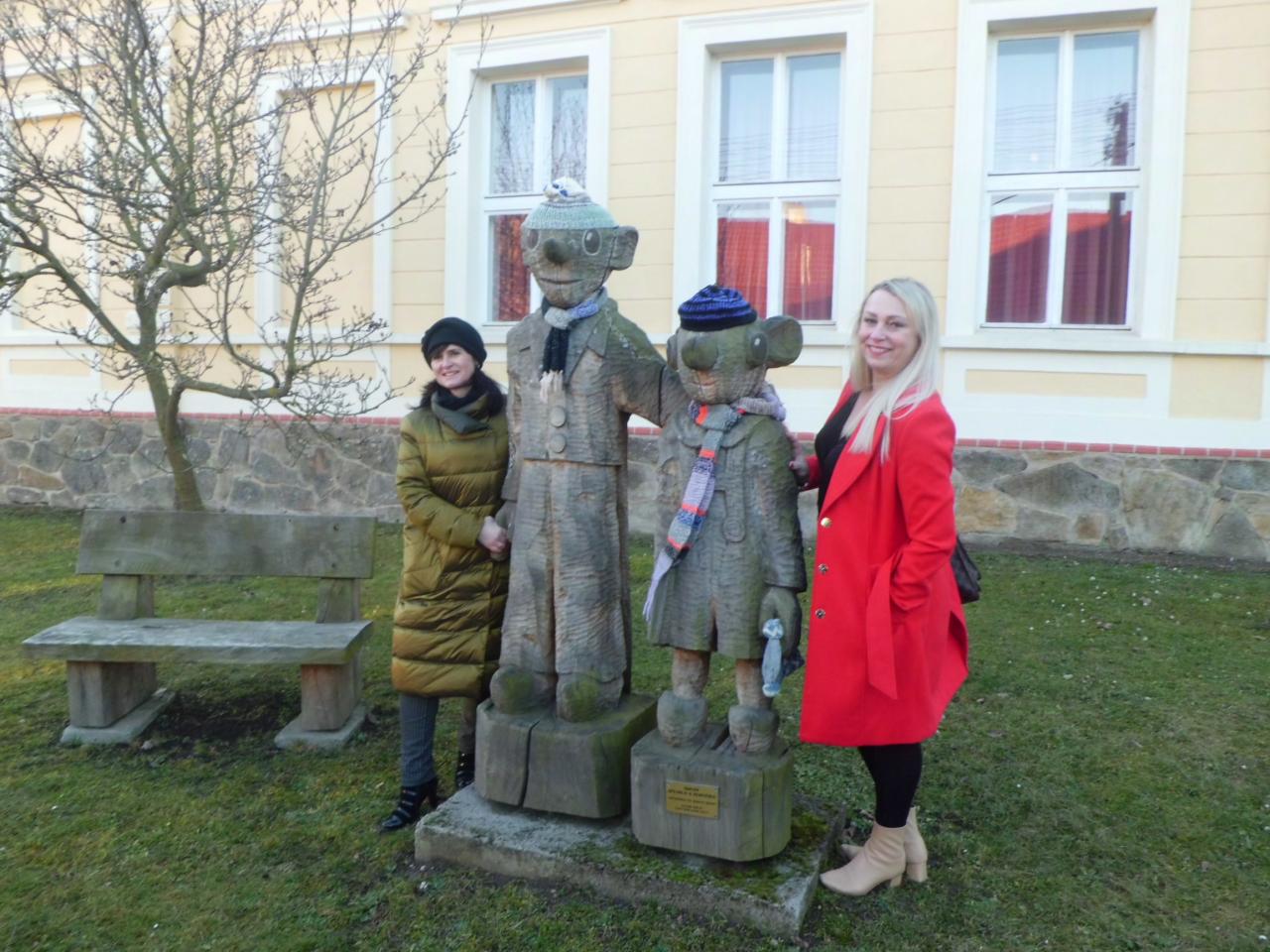 Europoslankyně Radka Maxová a poslankyně Parlamentu ČR Pavla Pivoňka Vaňková u soch Spejbla a Hurvínka v Mladějovicích