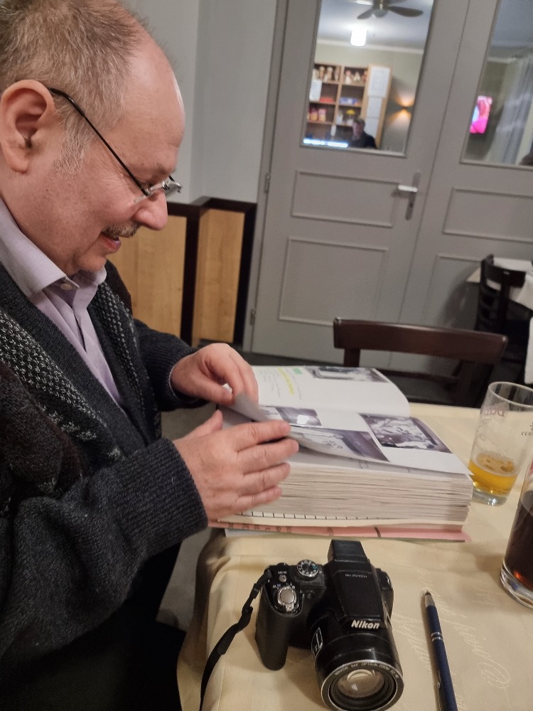 Prasynovec Josefa Skupy, pan Pavel Skupa si prohlíží kroniku mladějovického divadelního souboru Skupa