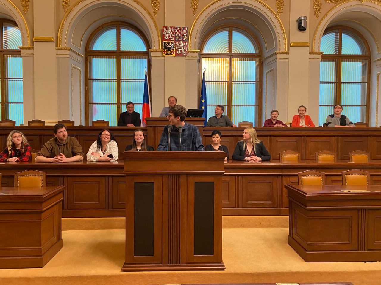 Čejetičtí hasiči při návštěvě Poslanecké sněmovny vyzkoušeli poslanecké lavice i řečnický pult