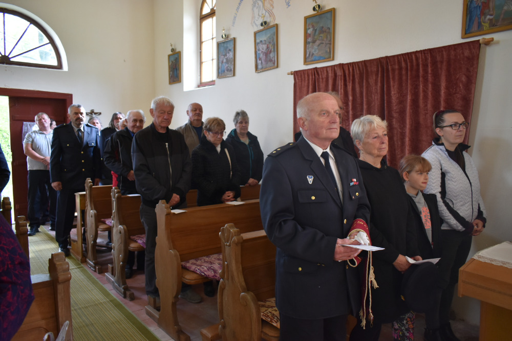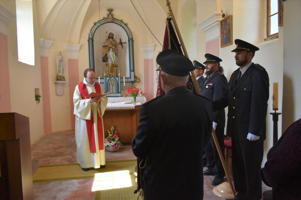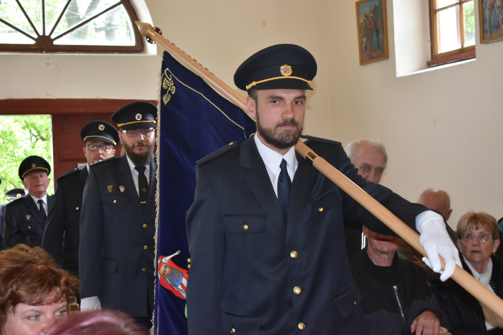 Mladějovický sbor s novým praporem před hasičskou zbrojnicí