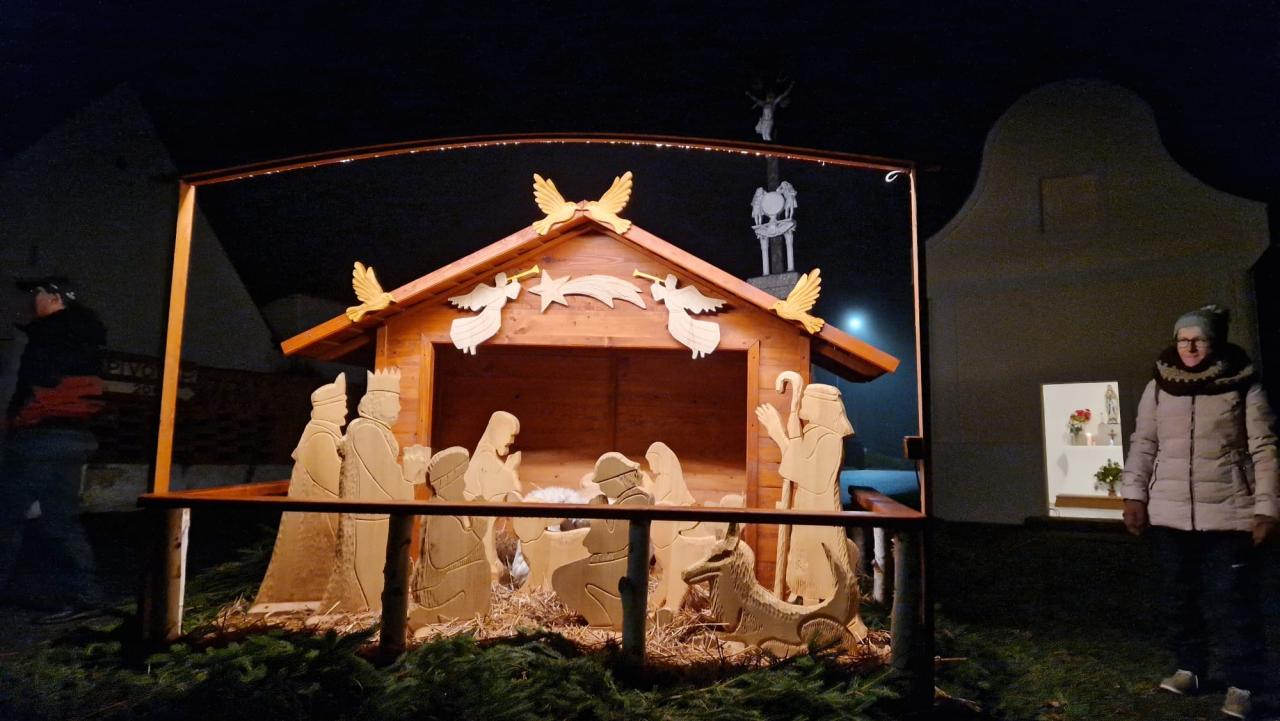 Dřevěný betlém před kapličkou dokáže i zahrát koledy