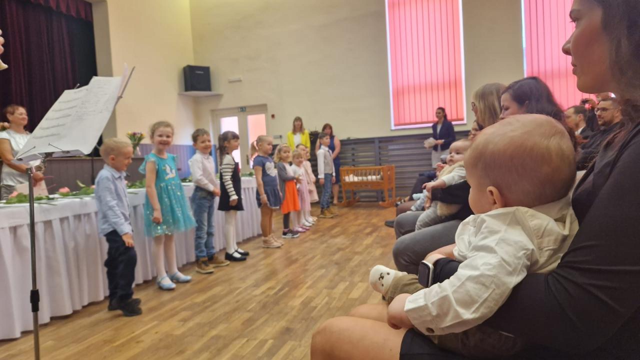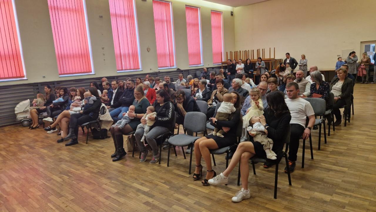 Rodiče a ostatní příbuzní s dětmi v sále kulturního domu
